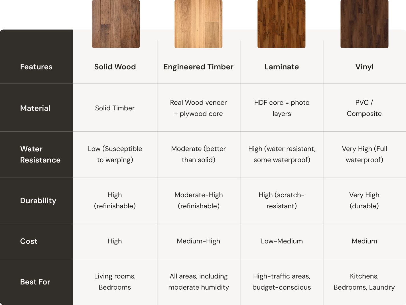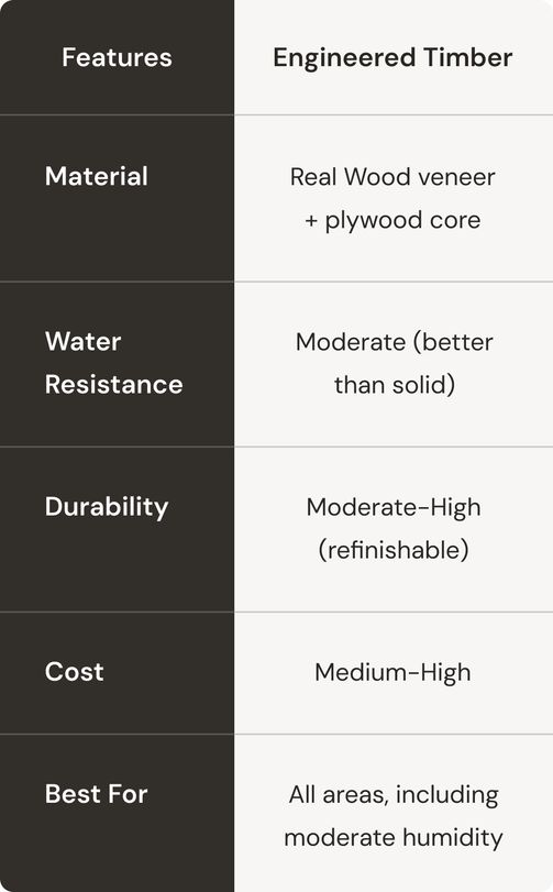 Premium engineered hardwood, built for the Australian climate. Durable, stunning, and installed the right way from the ground up.