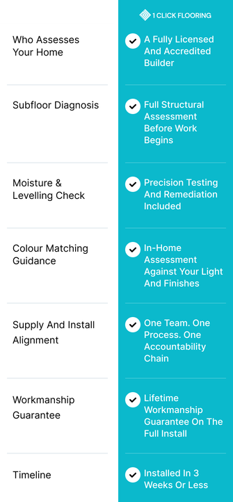 At 1 Click Flooring, we do it differently. Our Regret-Free Workmanship Lifetime Guarantee covers the entire installation for as long as your product warranty is active, which means if anything goes wrong with how we've prepared, levelled, or installed your floors, we'll come back and fix it - no questions asked, no charges, no excuses.